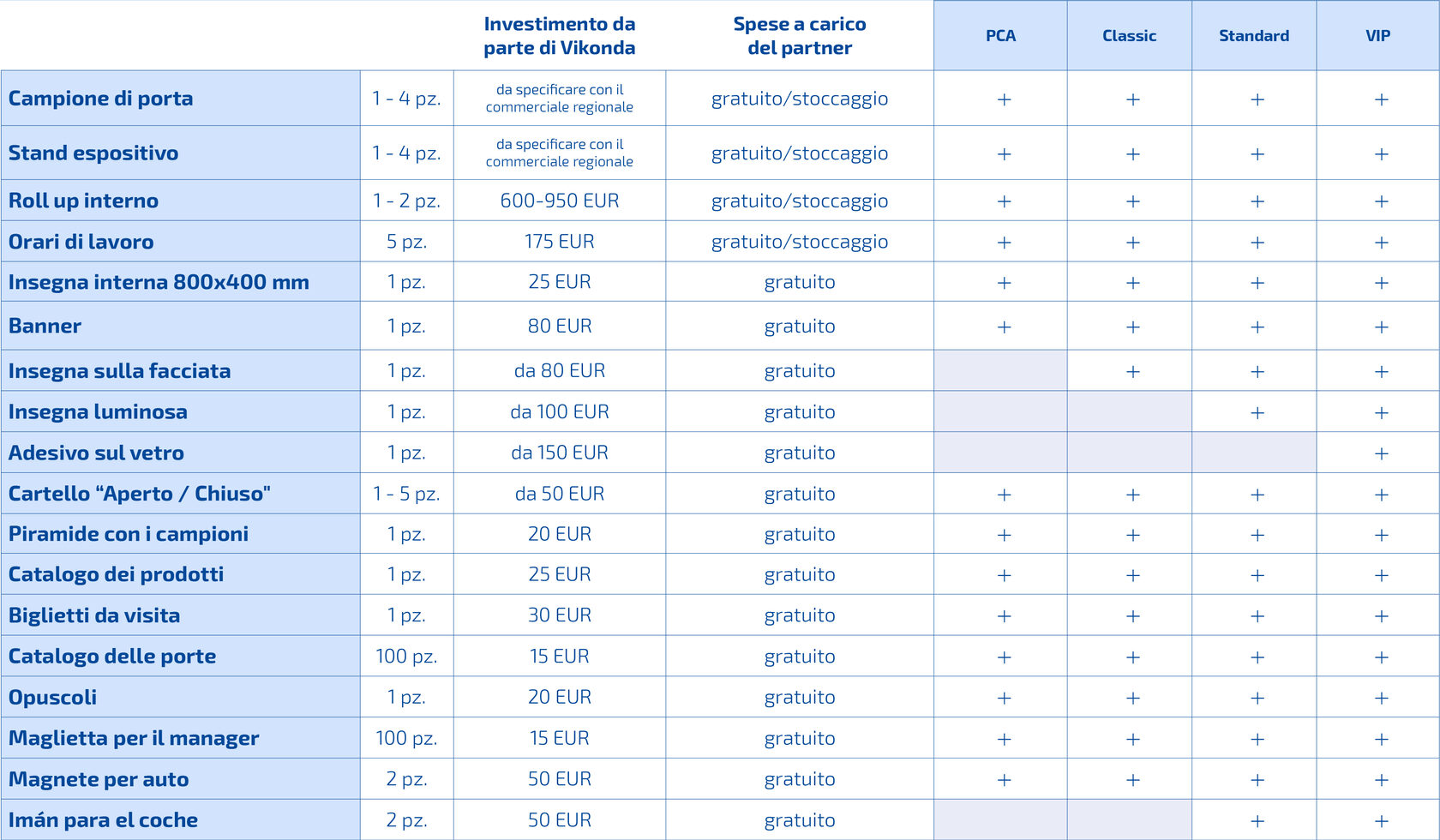 Vikonda fornisce: • segnaletica interna per l'allestimento dei locali • un adesivo con messaggio pubblicitario stampato sulla facciata • modalità di lavoro ( formato adesivo o tavoletta in PVC senza lati) • un cartello "Aperto/Chiuso" • banner sulla facciata • insegna luminosa sulla facciata